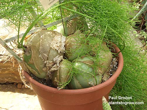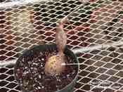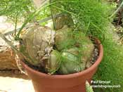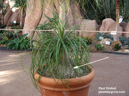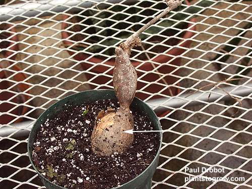 has a swollen base stem called a caudex. The white arrow is pointing to the caudex.