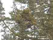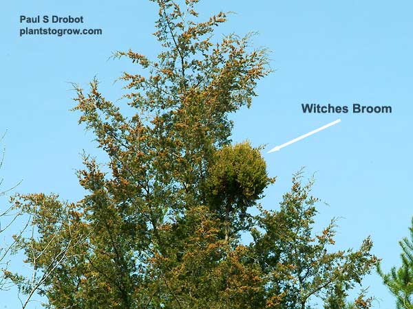 The white arrows are pointing to a witch' broom forming on a Red Cedar.