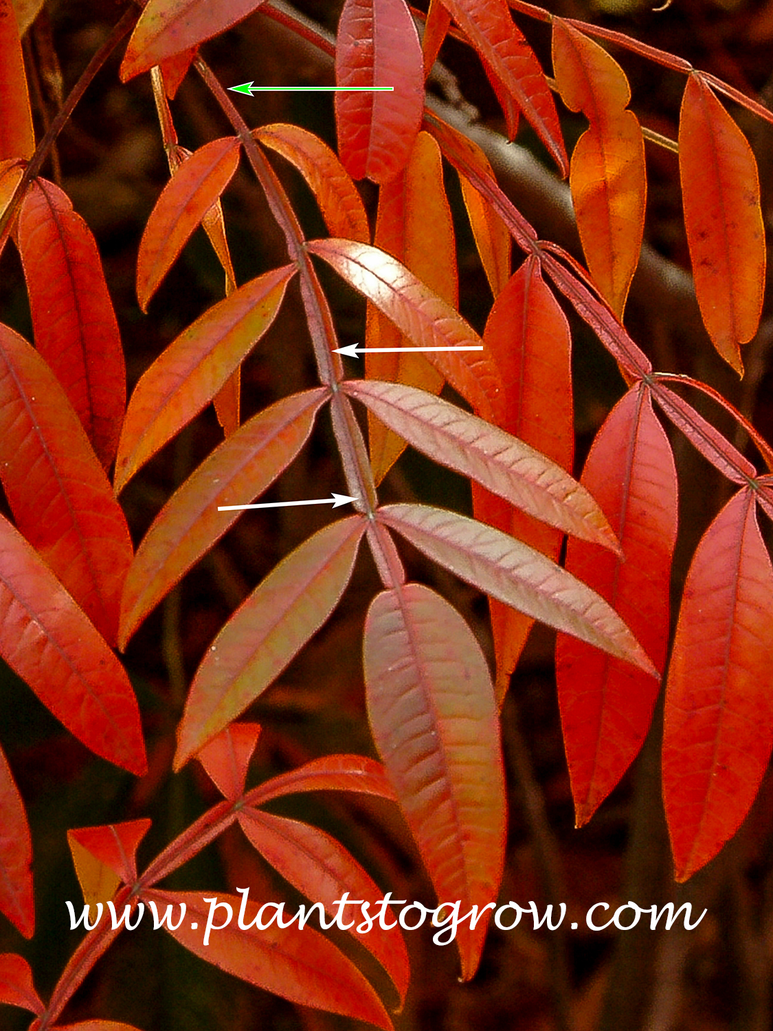| Leaves | Has glossy green summer foliage and spectacular red fall color. Its leaves are alternate and pinnately compound. The leaflets are borne on an alate (winged) rachis that gives the plant one of its common names: "winged sumac." |