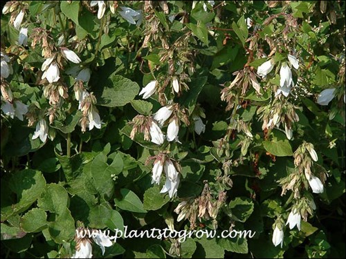 A vertical growing, white flowering Campanula with a long season of bloom. Has a tendency to readily reseed.
