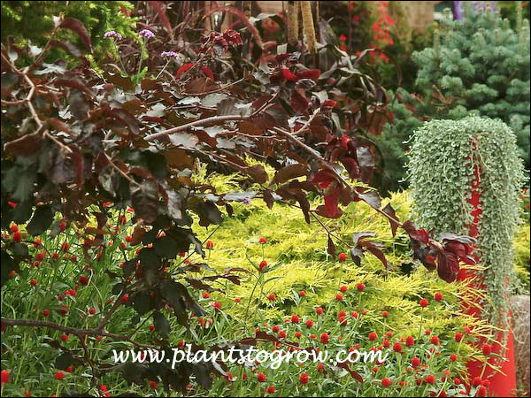 A spreading dwarf Beech with twisted and contorted branches and purple leaves.