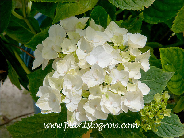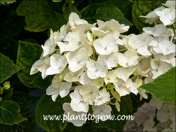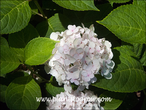 A Hydrangea that is part of the Endless Summer Collection Flowers start white, to creamy white fading with a blush of pink.