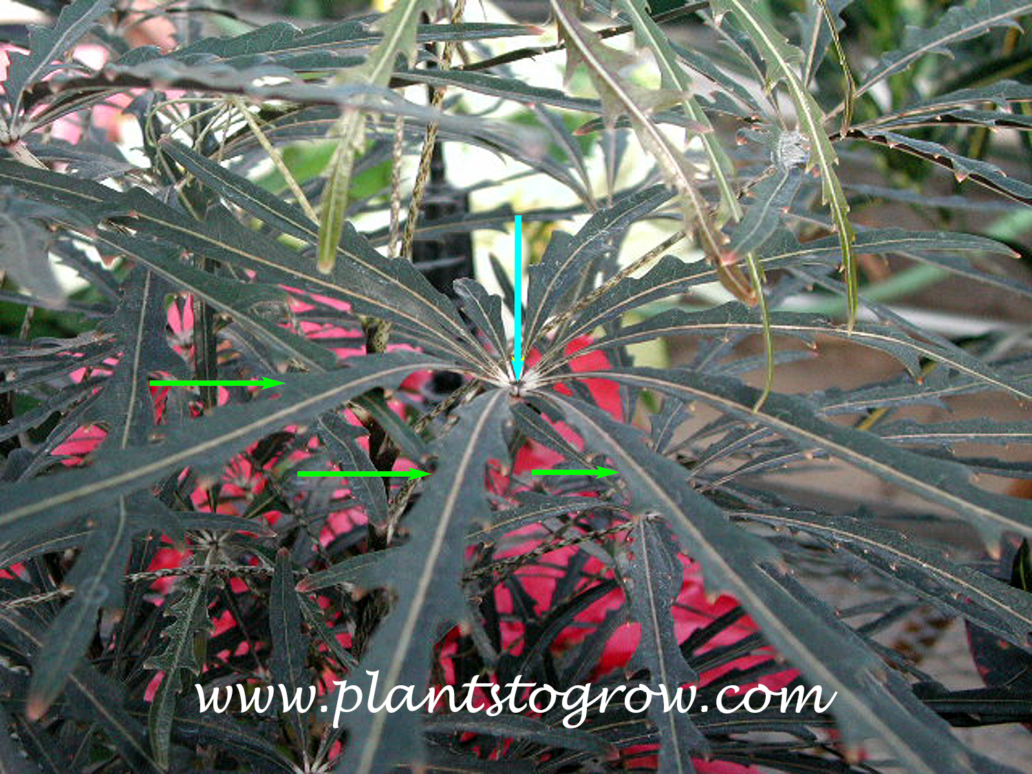 | Leaves | The leaves are palmately compound, with very narrow leaflets that are regularly serrately lobed. Young leaves are bronze, turning to greenish brown, and the petioles are mottled with white. Leaves on older plants are broader and more leathery. |