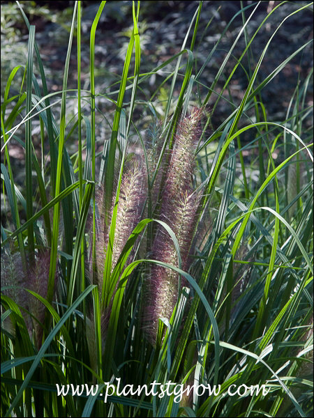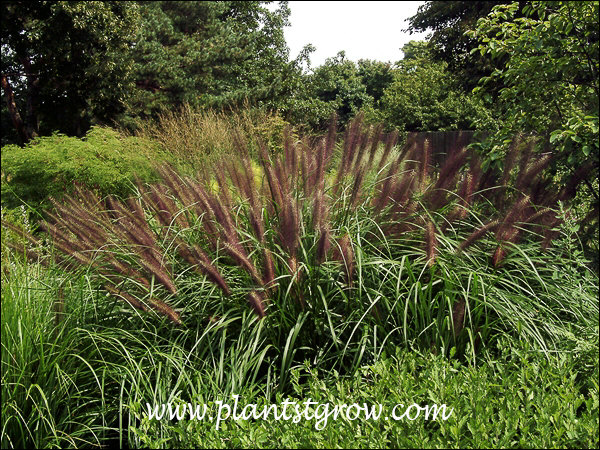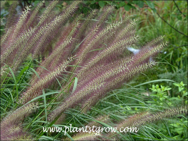 An early blooming Pennisetum with red hued flower heads produced in abundance.