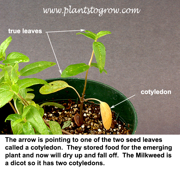 | Description | Cotyledons are called seed leaves. They are the first leaf-like structures to appear on a seedling. Cotyledons use the seed's stored energy and then drop off. True leaves appear after the cotyledons and resemble the mature plant's foliage. |