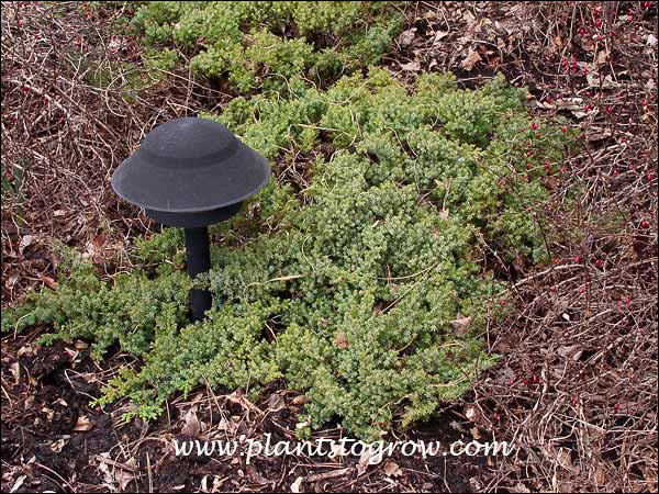 Less than 10" high, reported to spread over 12 feet, forms a carpet with branches radiating out from the center.