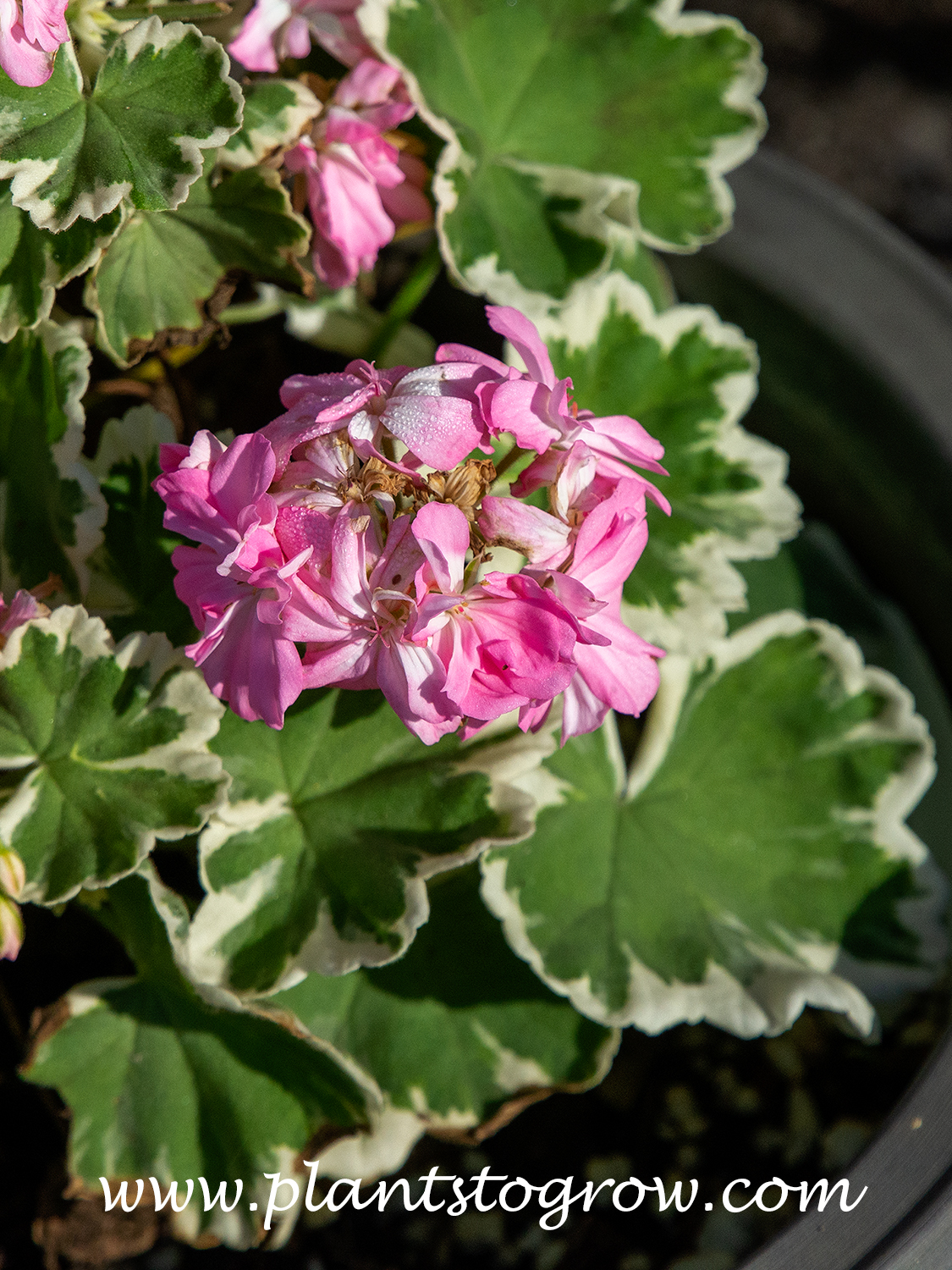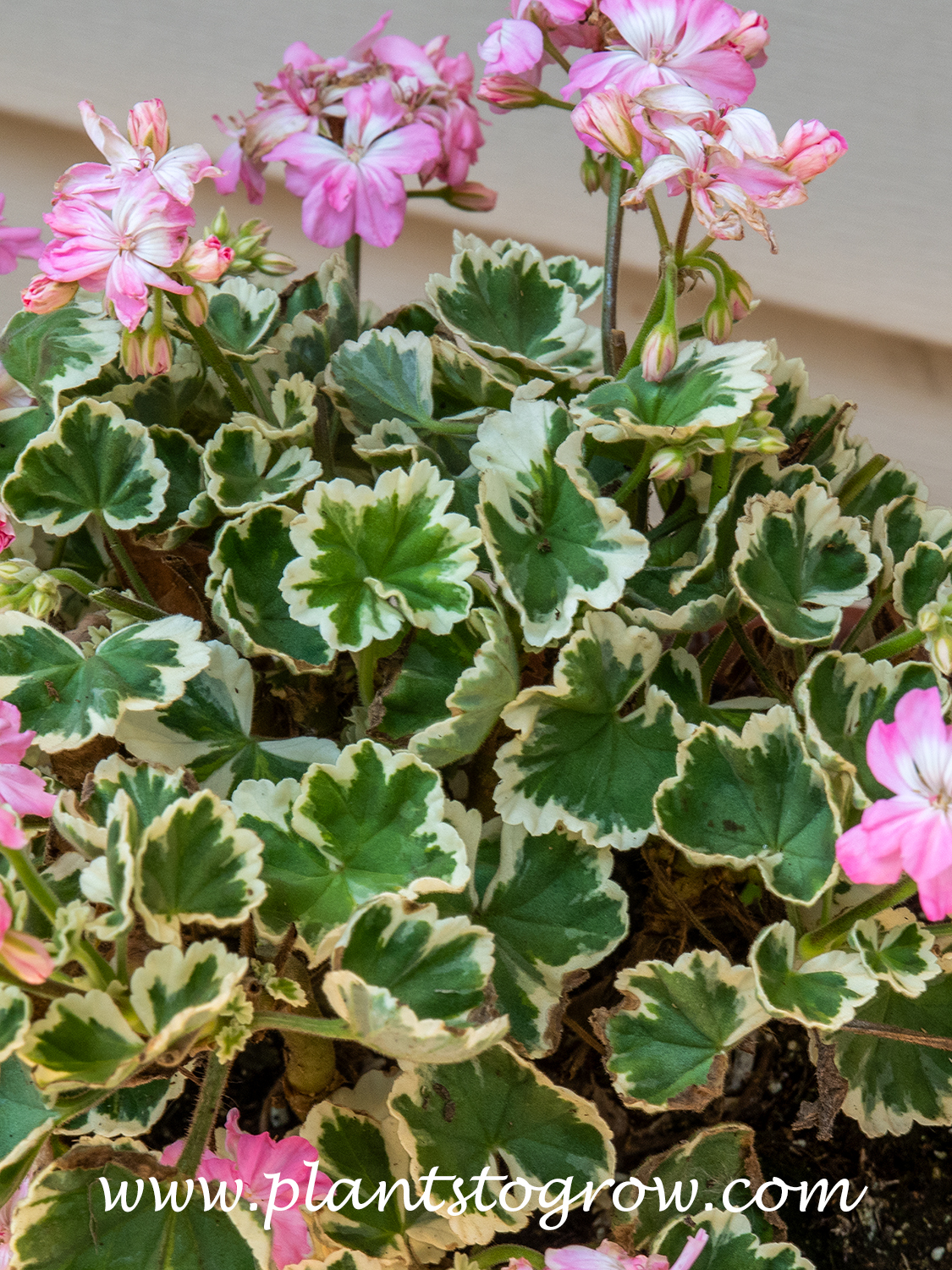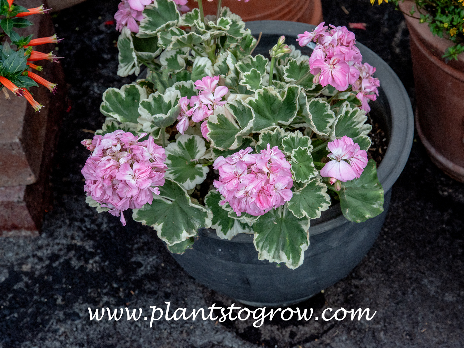| Description | Mrs. Parker Geranium (Pelargonium hortorum) is an heirloom white variegated plant with pink flowers. |