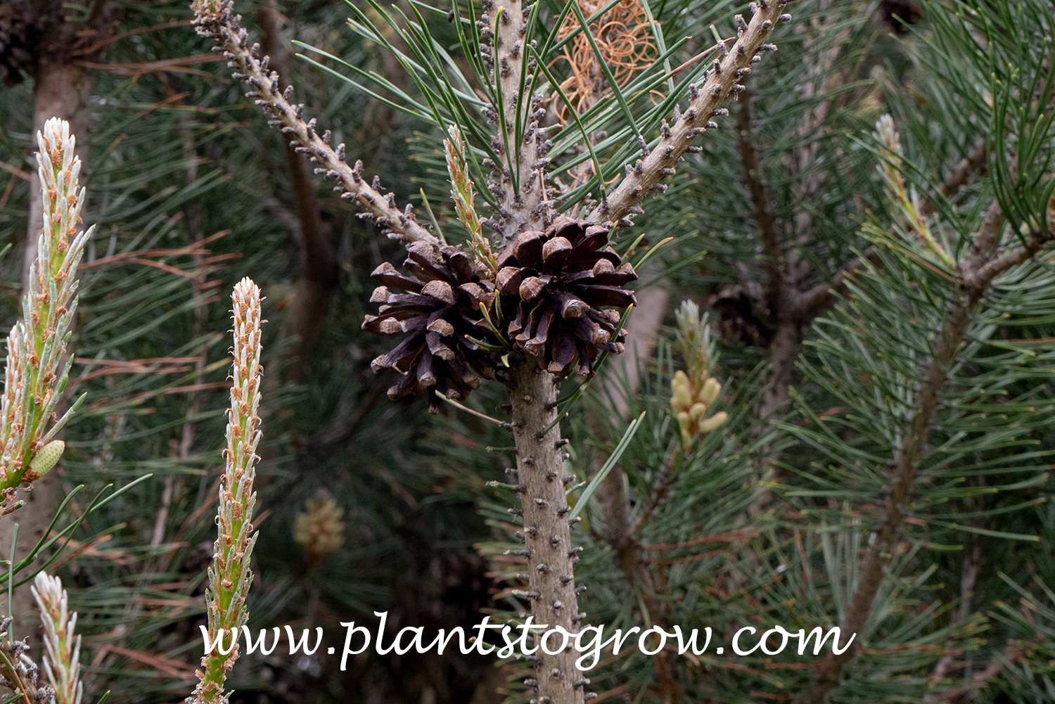 | Leaves | Needles in bundles of two together, and often slightly curved. The needles are dark green. |