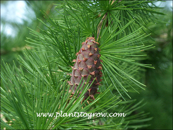 Monoecious; males light yellow, small and round; females yellow to red, with long, curved scales. The ovoid cones are 1-1.5" long and .75-1 inch wide.